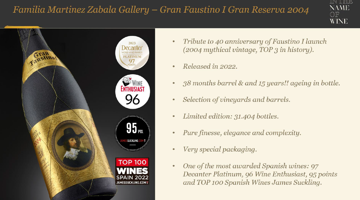 Today, Bodegas Faustino, located in Rioja Alavesa, encompasses 650 hectares. Faustino's wines are exported to over 100 countries worldwide, and the company is the world's best-selling producer of Gran Reserva.