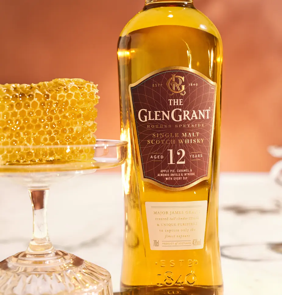 The Glen Grant 12-Year-Old captures complexity and craft in its bright golden hues. Matured in hand-selected ex-Bourbon barrels and Oloroso Sherry casks, this single malt reveals an inviting collection of flavours as it balances both delicate and rich notes. From apple pie, toffee, caramel and almonds through to honey and subtle spice, this promises evocative character in every sip.