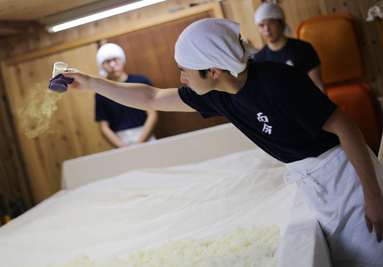 Kiyasho brewery has been in use for twohundred years since its founding and the traditional methods have been stillusing to brew. Our own yeast is selected to produce Jikon brand lineup becauseof it is appropriate for low temperature fermentation. The result of sake isrefined, somewhat acid taste and fruity aroma. Small quantity of rice arecarefully rinsed and then used to produce handmade Koji which is allowed to slowlyfermentation. Daiginjo is brewed by “Fukurozuri”, which is one of the most traditional pressing methods of sake.