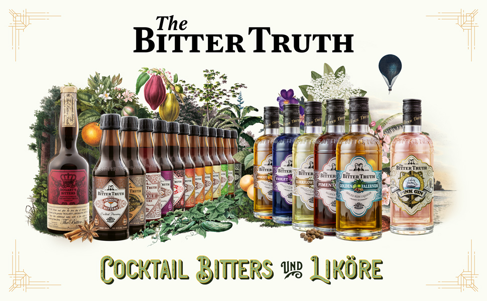 In August 2006, the first productsfrom The Bitter Truth were released: With Orange Bitters and OldTime Aromatic Bitters being first, followed shortly after by LemonBitters. Since then additional flavors have been added to the range: JerryThomas Bitters, Creole Bitters, Celery Bitters, GrapefruitBitters, Chocolate Bitters, Tonic Bitters, Peach Bitters, CucumberBitters, and Olive Bitters. The much loved Bitrters Traveler`s Set holds5 different flavors in a convenient size of 100ml/3 oz suitable for carry-onluggage and has later seen a little brother when Bitters Bar Pack with5 modern flavors was released. Also, The Bitter Truth has released arange of fine liqueurs & flavored spirits such as Apricot Liqueur, VioletLiqueur, Elderflower Liqueur, Golden Falernum, Pimento Dram & PinkGin.