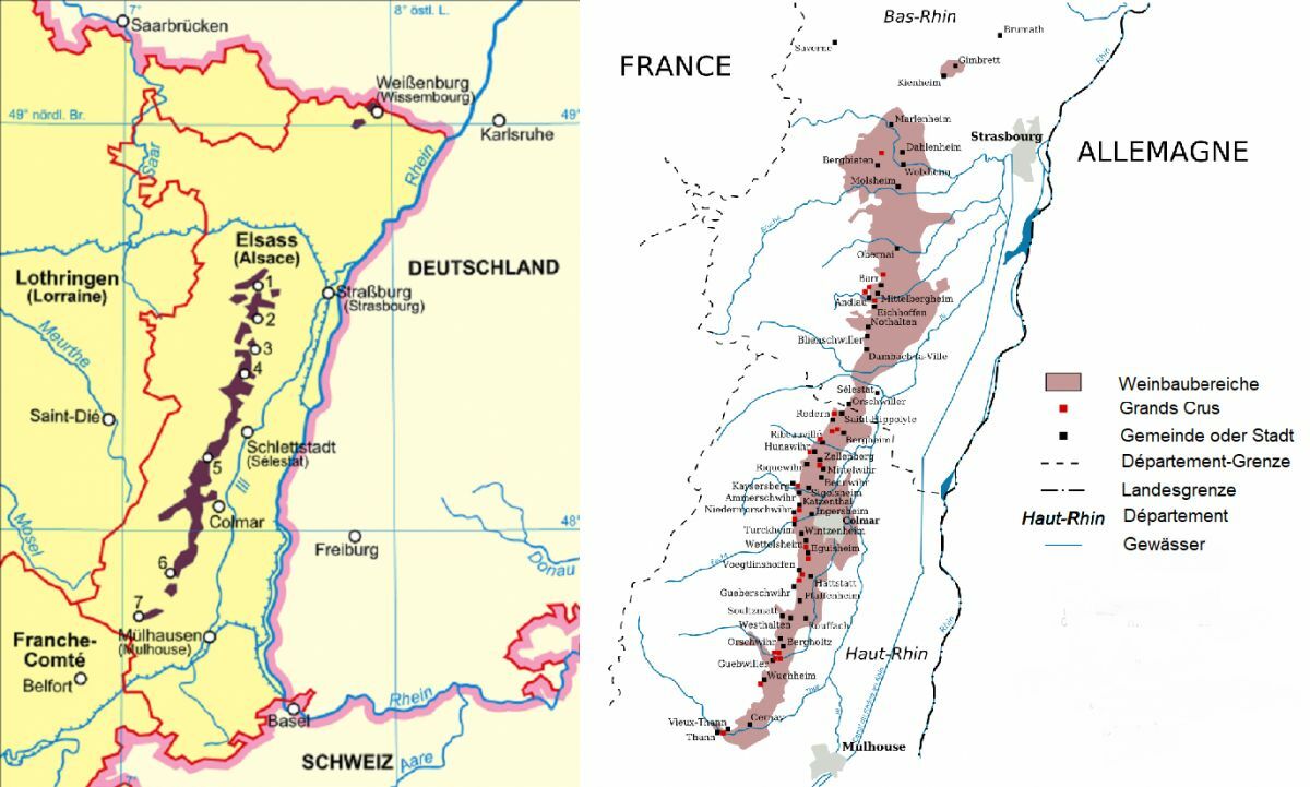 阿爾薩斯(Alsace)位於法國東北部,東鄰德國,西倚孚日山脈(Vosges)。半大陸性氣候伴隨寒涼的氣溫,再加上孚日山脈(Vosges)阻擋了來自北邊和西北邊海洋水氣的影響,使得整個產區成為法國降水量最少的產區(年均500-600毫米)。