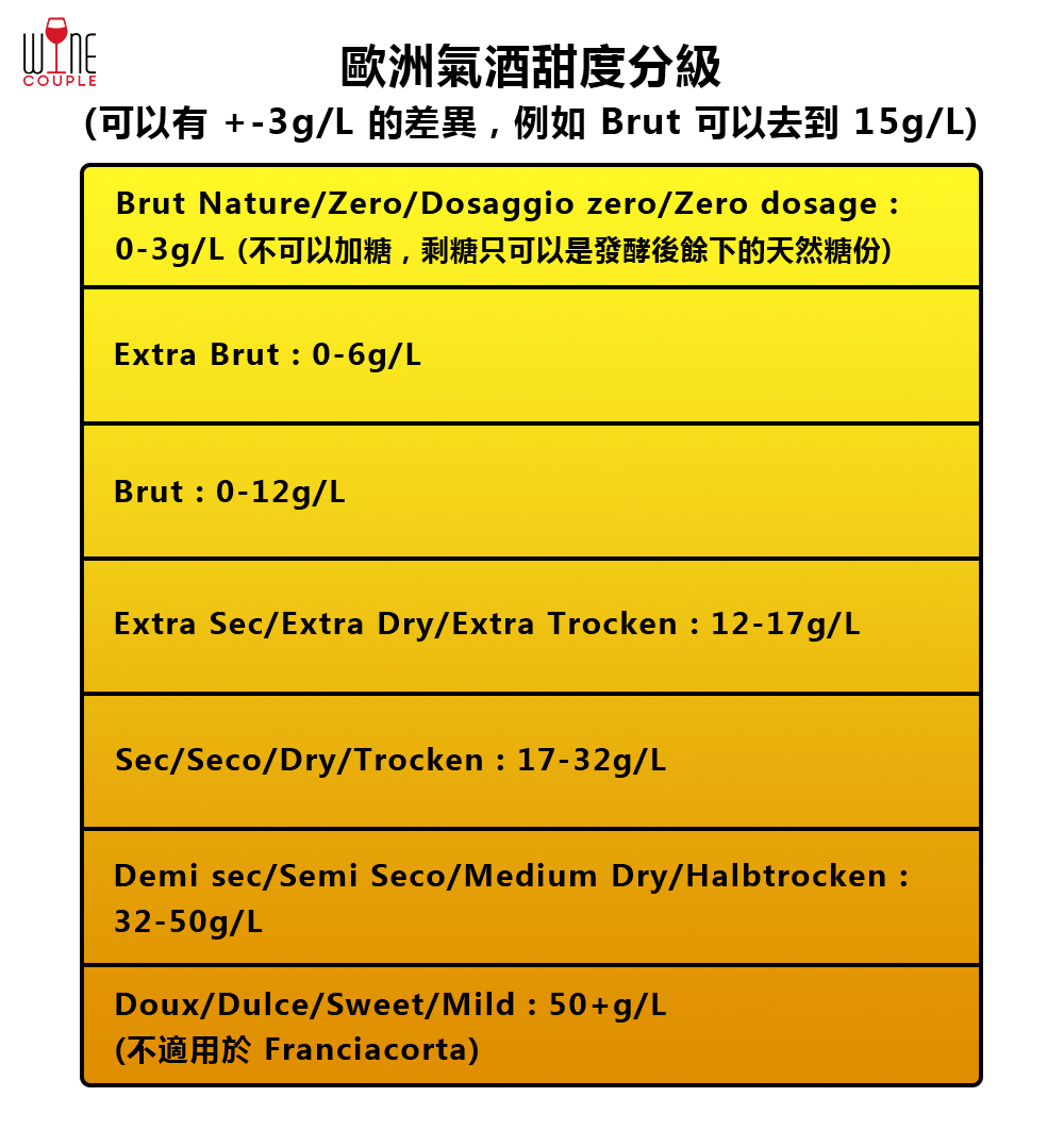 應用歐洲氣酒甜度分級 (可以有 +-3g/L 的差異,例如 Brut 可以去到 15g/L)