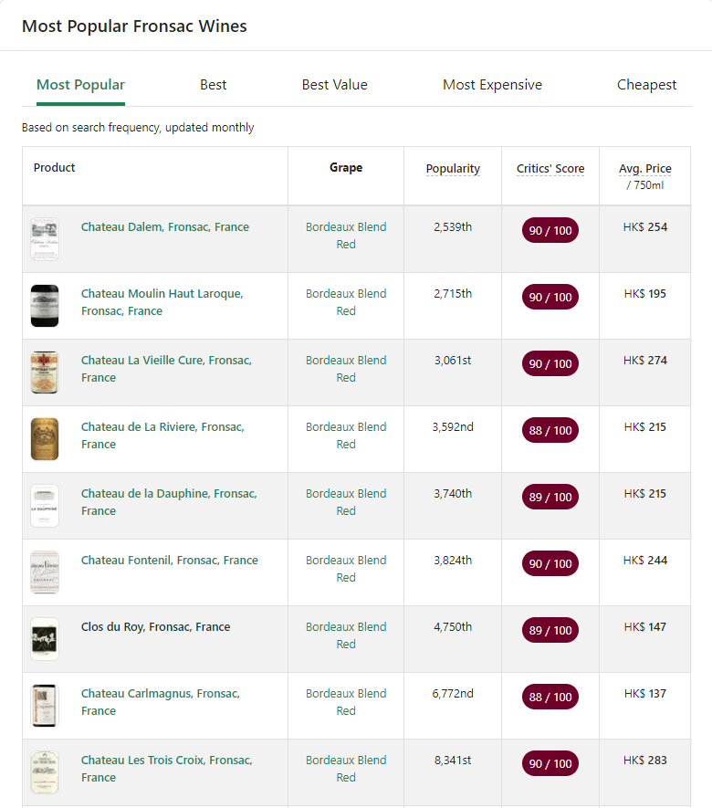 圖中為Wine-Searcher最受歡迎Fronsac區紅酒
