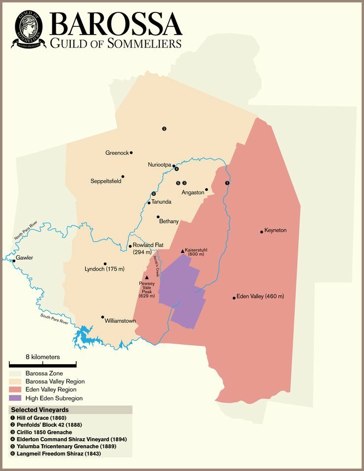 Barossa Valley 是澳洲南部很重要的澳洲葡萄酒產區,特別是知名葡萄品種 Shiraz 所釀成的濃鬱強勁紅酒。產區擁有許多樹齡幾十年的西拉葡萄樹,有些甚至已達 100 至 150年,種植西拉葡萄的歷史非常悠久。地形主要是丘陵為主及少數部的高原,大陸性的氣候晝夜溫差大,日照時間長,濕度低,讓葡萄更集中濃鬱。大部分的地方會使用灌溉來彌補生長季節時的雨量不足。炎熱的氣候意味著葡萄容易成熟、含糖量高、酸度較低。