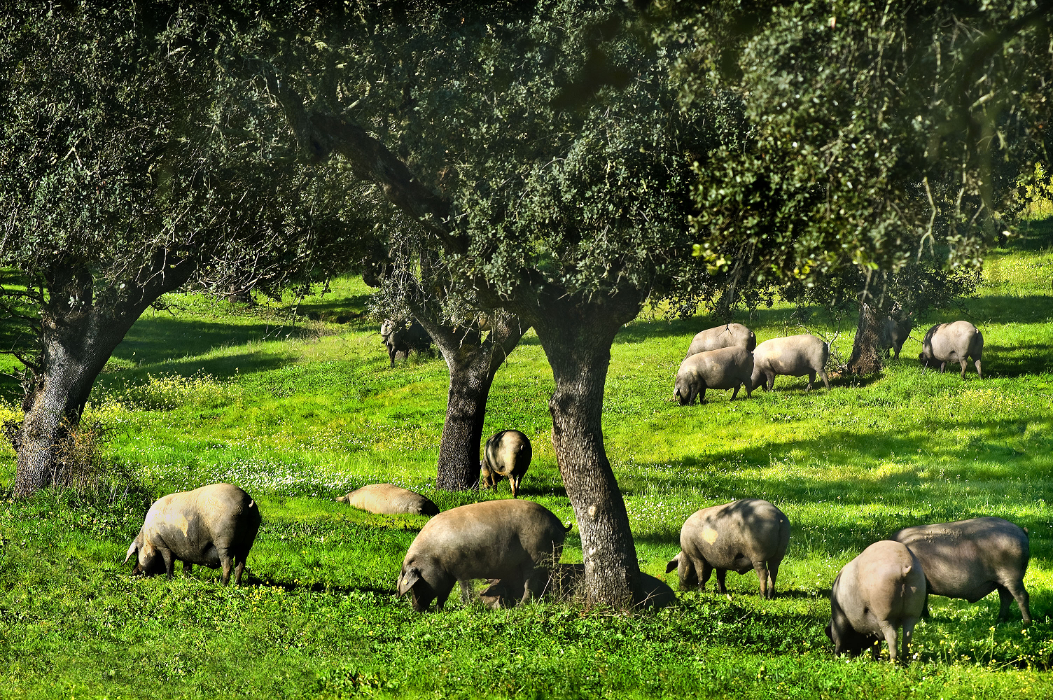 牧場之大和各種生態的平衡被稱為德埃薩牧場 Dehesa。天然牧場由人去加以保育和維護,草地和橡果樹滿滿的環境確保黑毛豬能充分吸收到足夠的營養 (橡果含高蛋白質、碳水化合物、脂肪、各種維他命甚至礦物質),而橡果樹可是要 10 年或更多時間才能結出橡果。