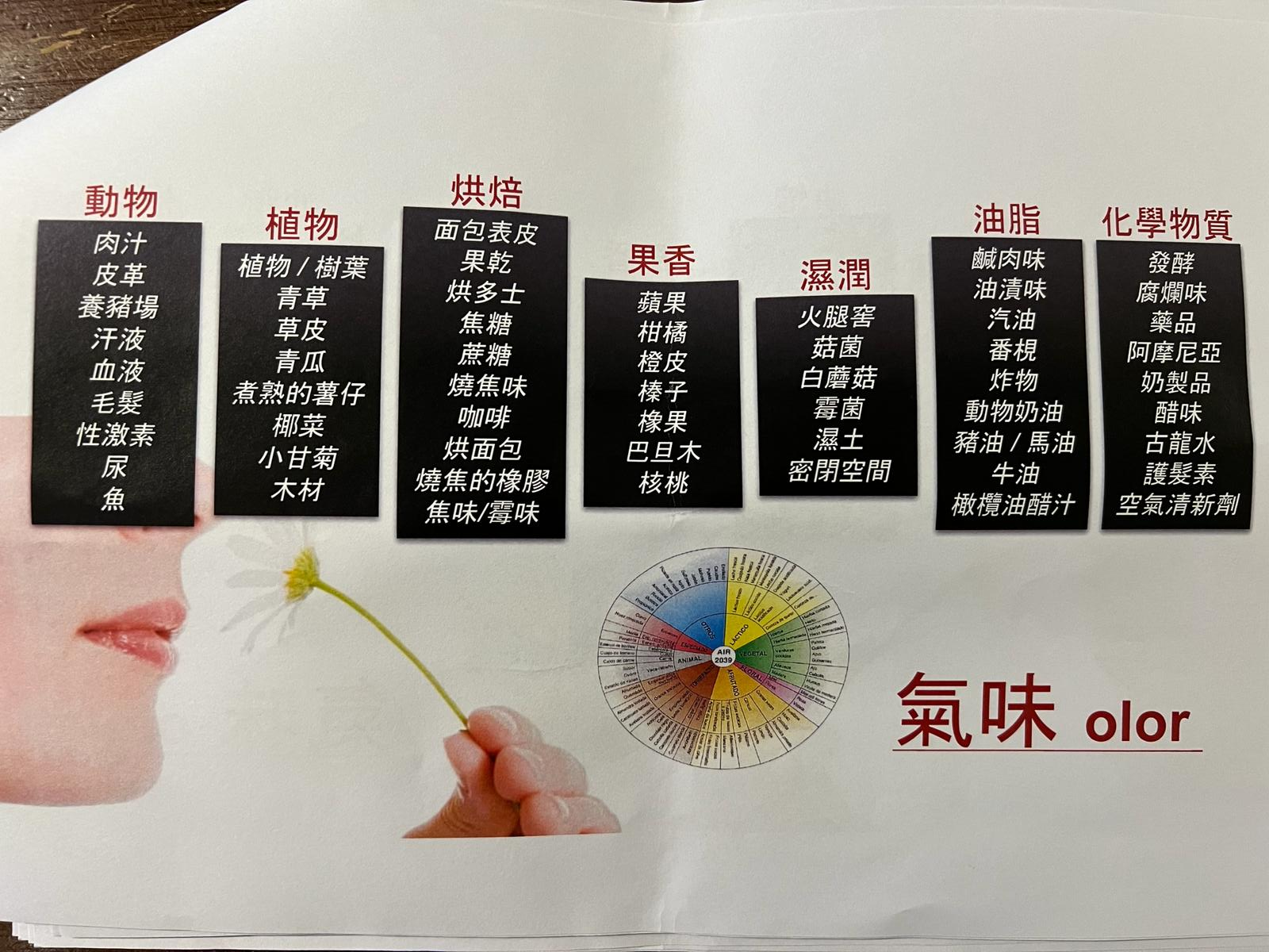 風乾火腿的另一個大指標就是風乾熟成的時間,2014 的新法例規定固化時間至少為 20 個月,但當然實際上不同風格的產品都會有更長的陳熟時間,24 個月至 48 個月甚至去到 7 年 8 年也有,越長時間製作成本越高當然價錢都會比較高,但主要也是口味上的分別。一般時間短一點肉香咸香都會比較新鮮主導,肉質也會比較嫩。而越長時間就越會陳熟出不同層次的味道,更多水份流失亦會令肉質更緊緻濃郁。下圖取自西班牙伊比利亞豬肉產業協會(ASICI)「伊比利亞火腿,歐洲世界大使項目」專業侍肉師課程(Iberico Ham Masterclass)的教學,可見火腿也可以帶出多種不同層次的香氣,除了嗅覺,味覺上都可以感受到甜酸苦咸鮮五味,也跟葡萄酒一樣可以有味道持久性 (finish)的強弱之分。