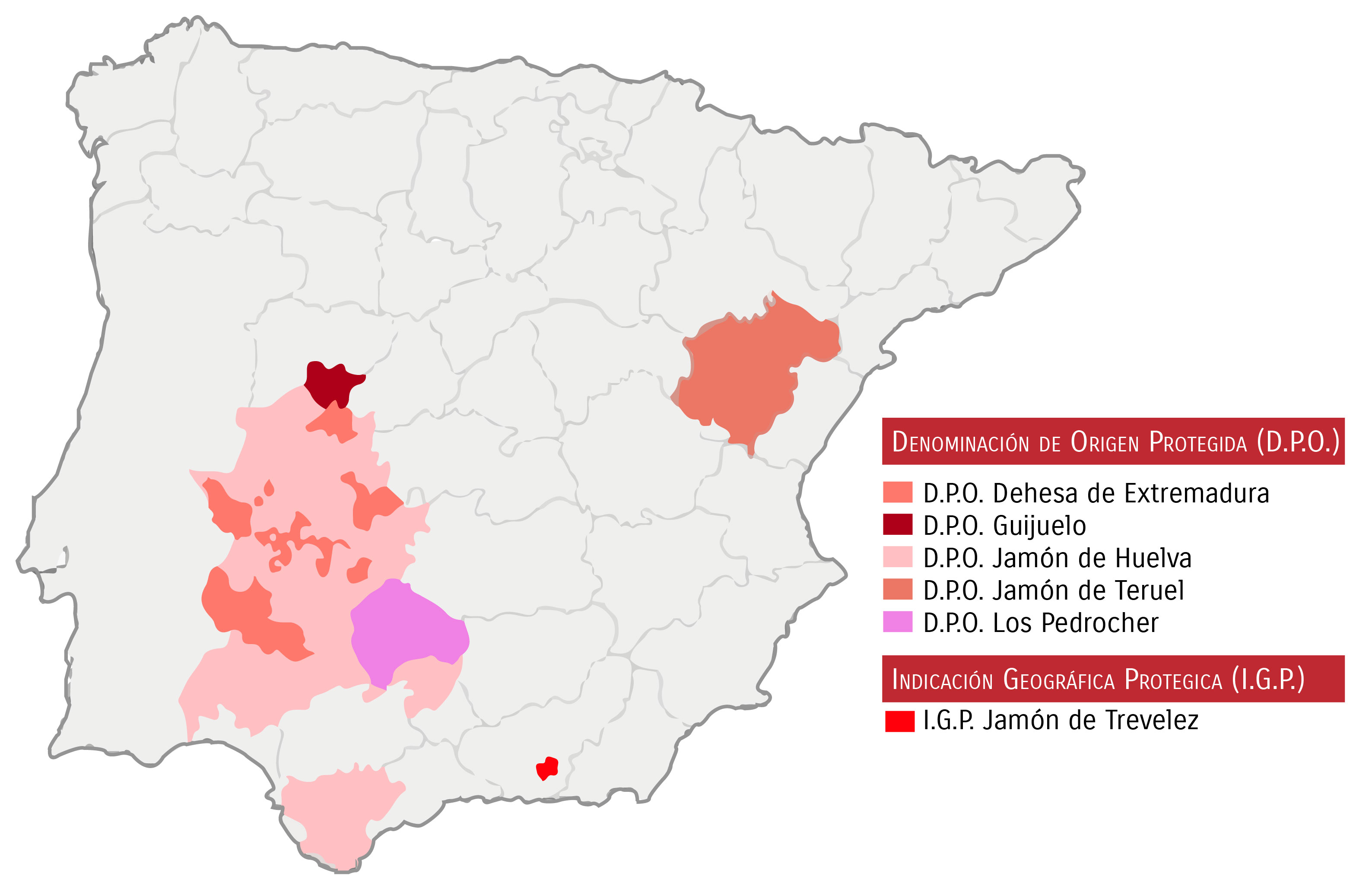 而除了製作過程外,Iberico ham 都像葡萄酒一樣有產地認證,不過沒有包含所有地區,只有四個 DOP,雖然不能說 DOP 的就比較好,但 DOP 的整個生產過程在規例上都會稍為嚴格去確保質素,而且 4 個 DOP 各有不同的地理環境,也跟葡萄酒一樣各自有著稍為不同的風味。