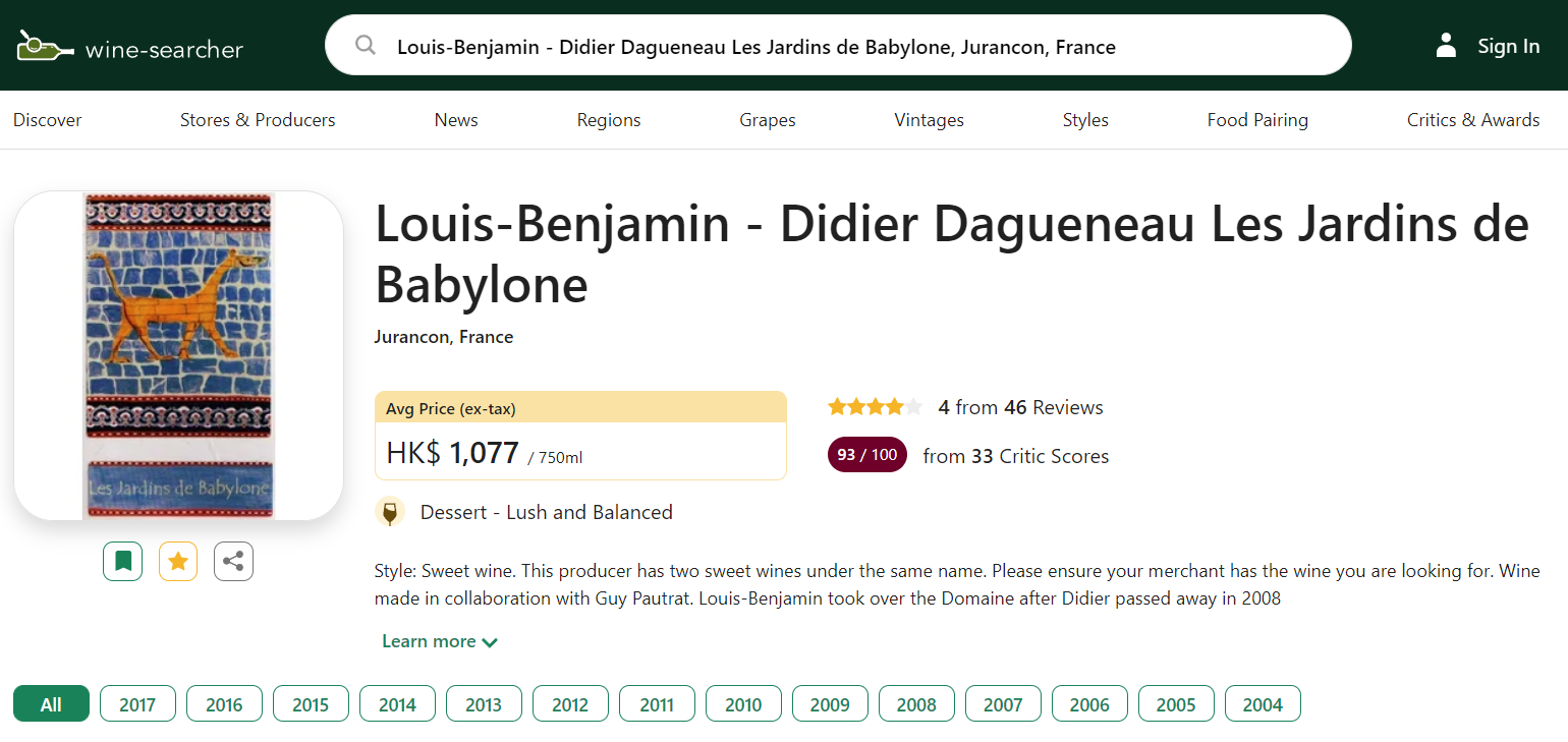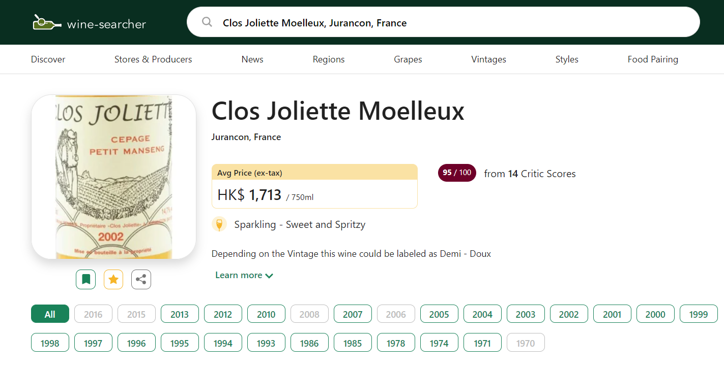 產區本身亦有一個堪稱Unicorn winery嘅Le Clos Joliette, 到2015年莊主過身後,畀一個熱愛葡萄酒嘅人買入,先有部份年份同極少量嘅酒流出市場(92年嚟都無流出過市場),咁耐以嚟亦只係得Vinous嘅Neal Martin有評過2個年份,分別係October 2019 評嘅1970 Jurancon 94分 同埋 May 2018評嘅1978 Moelleux Jurancon 95分。連佢都話:"I cannot remember writing about such an enigmatic wine"!