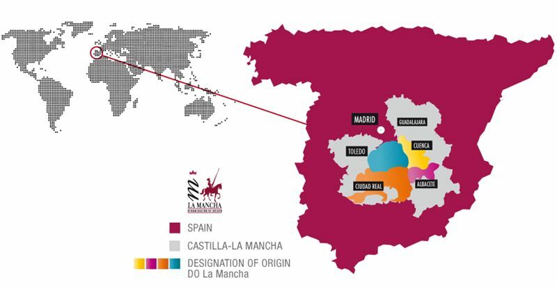 La Mancha 涵蓋了卡斯蒂利亞-拉曼恰自治區的阿爾巴塞特省、雷阿爾塞特省、昆卡省和托雷多省,是西班牙最大的法定產區。該地區以盛產橄欖油與葡萄酒而著稱。酒品特點為用紅葡萄與一定比例的白葡萄混合釀造的,適合即時飲用,果味清淡。拉曼恰地區的北面與馬德里法定產區相鄰,幾乎將自治區南部的另一個法定產區瓦爾德佩涅斯完全包圍。曼恰地區大部分位於中央高原微微向北傾斜。瓜迪亞納河流經這一地區,而且部分河段位於地面下,特別需要說明的是拉曼恰是塞萬提斯創作於17世紀的小說《堂吉訶德》的主人翁的故鄉,而“堂吉訶德故鄉”的名聲似乎比拉曼恰更加響亮。