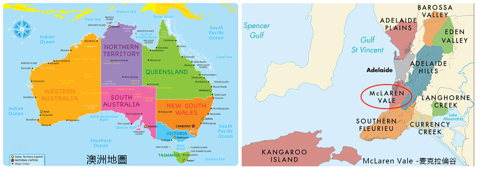 麥克拉倫谷(McLaren Vale)位於弗勒裡厄(Fleurieu)的中心地區。麥克拉倫谷擁有低海拔和溫暖的地中海氣候,(35° 19'S緯度,138° 32’E經度, 總葡萄園面積6,209公頃)夏日陽光充足。伴隨著涼爽的風。來自附近洛夫特山嶺(Mount Lofty)山谷之間和聖文森特灣(Gulf St Vincent)的涼爽微風促進了了整個地區的氣候變化,使每個葡萄園都變得獨一無二,以出產葡萄酒而聞名。該產區的居民對於美食佳釀有著特別的熱情,這或多或少解釋了這個產區葡萄酒為何會如此受歡迎。