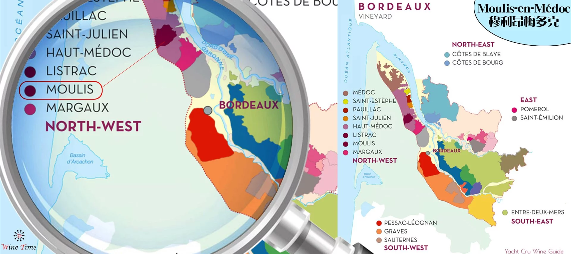 Moulis的地名來自法語中的 "moulin" (風車)。今天,在Moulis地區,仍然可以看到3個古老的磨坊。這個產區1938年才從上梅多克中獨立,建立自己的 Appellation Moulis-en-Medoc Controlle或Appellation Moulis Controlle標誌。 其產區限於Moulis村與Listrac,Lamarque, Arcins, Avensan, Castelnau, Cussac的部分村莊,但是不包括河流新沖積的土壤以及表面覆有砂土的不滲水層的土壤地區。其他與St.Esitephe、Pauillac、Saine-Julien、Margaux等相同。