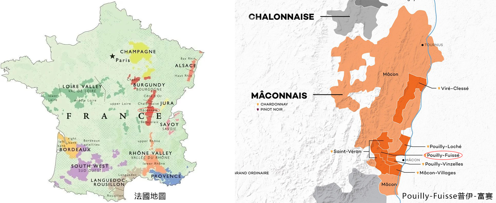 此外,Macon 土壤以不同成份和比例的石灰石 limestone 和黏土 clay 為主, 而 Pouilly-Fuisse 比 其他同級產區如 Saint Veran 擁有更高比例的石灰石 limestone 和 花崗岩 Granite,排水性更高,令那裏的葡萄更成熟,所以 2020 年 Pouilly-Fuisse 有 22 個葡萄園升格為 Premier Cru。