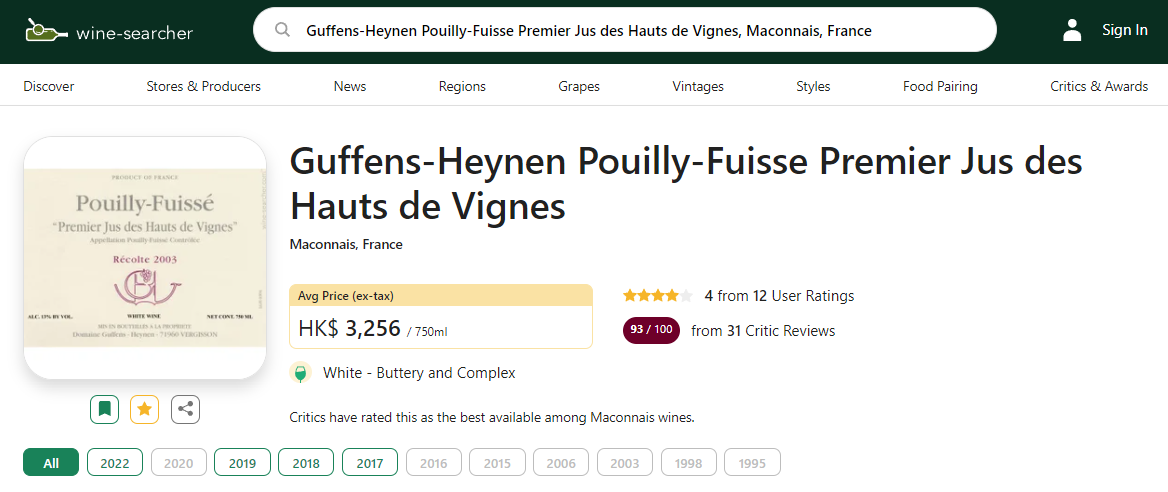 當中更有神級酒莊,被稱為 Master of Chardonnay 的 Jean-Marie Guffens 的酒莊 Guffens-Heynen,質素和酒價都媲美甚至超越傳統 Grand Cru,更有 2 款 Pouilly-Fuisse 獲得 Wine Advocate 100 分滿分,是史無前例的強!也證明 Pouilly-Fuisse 的潛力~