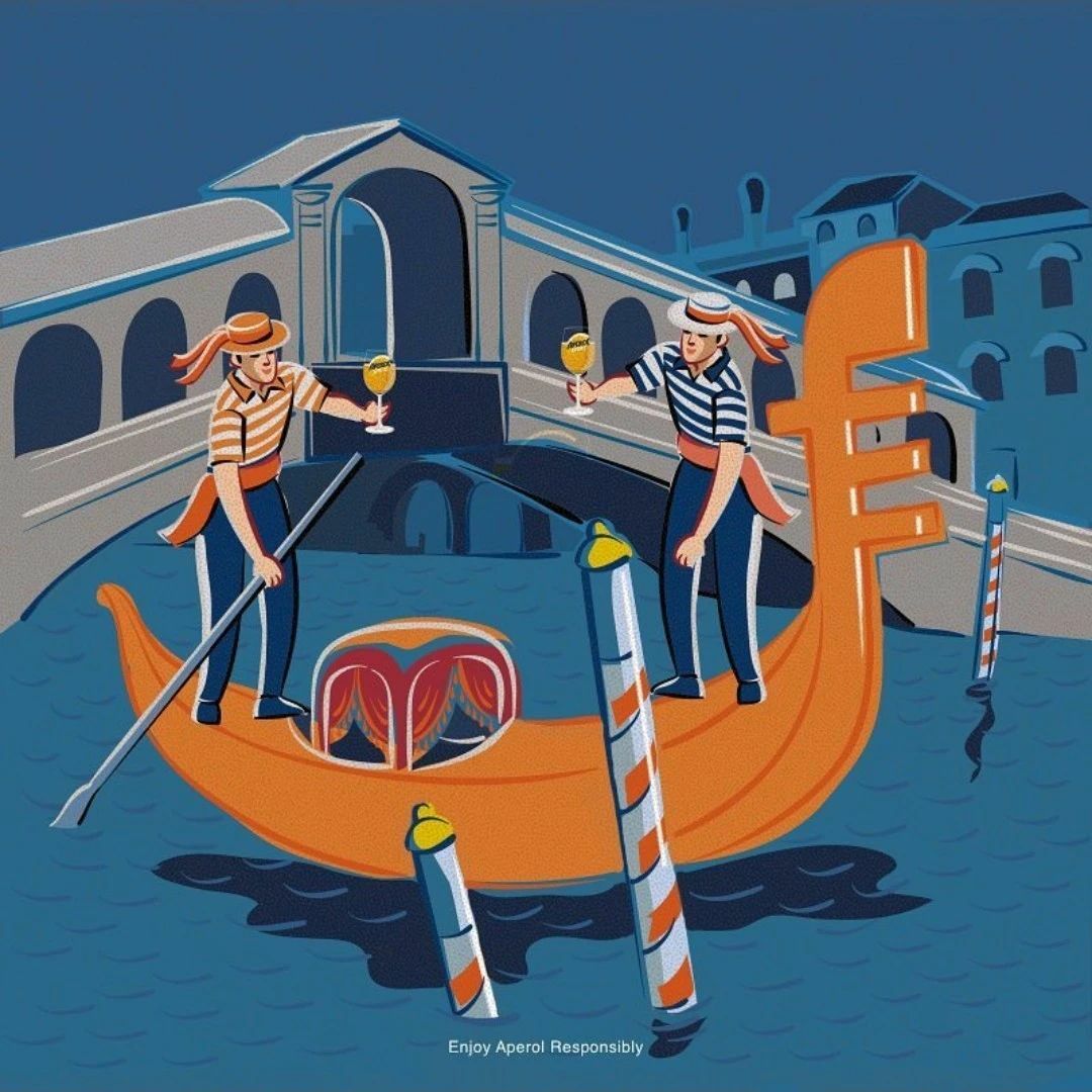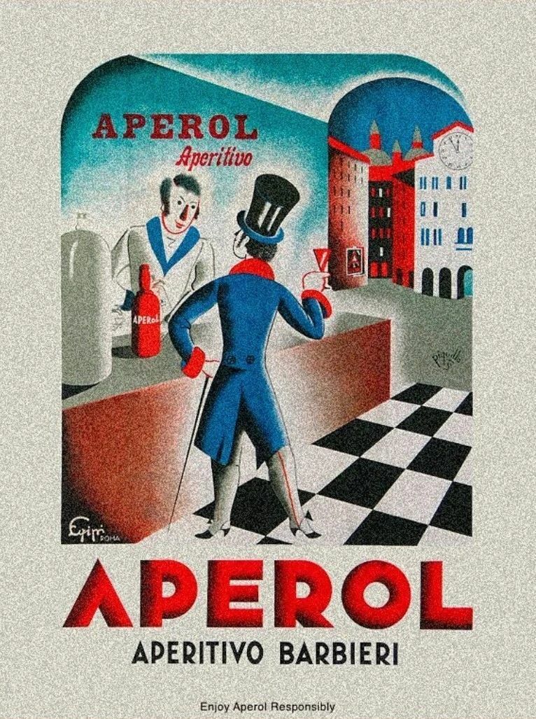 義大利語中“Aperitivo”(開胃酒)早在1786年就出現於義大利都靈,字面意思就是餐前喝喝小酒聊聊八卦,通常是在正餐前一個小時。不過以義大利人的天性,喝上一整個早上或者一整個下午都不足為奇。Aperol的名字據說就取自Aperitivo。藝術家Carlo Pandolfi繪製的這幅海報,描繪一位有錢有閑的紳士,路過酒吧,酒保會意地打招呼:“還是老樣子?”睜大眼睛,廣場上的時鐘即將指向正午12點,說明這位紳士睡到日頭高照不疾不徐地打扮好,早午餐前還要有儀式感地來杯Aperol。