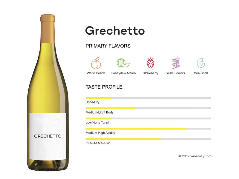 是成名於意大利的白葡萄品種。他的祖先大概在中世紀的時便存在,現在主要在意大利的中部翁布利亞(Umbria)種植。Grechetto在成名,其實是各類葡萄的配角,為其他葡萄調和酸度、香氣、口感等,其中霞多麗(Chardonnay)是主要搭檔。Grechetto其實本身也算是一款體格優秀的葡萄,有足夠的耐力忍受寒冬,也有厚皮對抗霜黴病(Downy Mildew),高酸中身,非常適合釀造甜酒,在混合別的葡萄時可以增加葡萄酒的豐富度和結構感,經過蘋果乳酸發酵並經過橡木桶陳釀的酒,有時還會具有杏仁等堅果風味。由Grechetto所釀造的白葡萄酒酒香氣清幽,主要帶檸檬和花香。