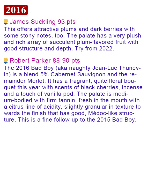 而因為創新大膽嘅車庫酒風格令最出名嘅酒評Robert Parker都笑稱佢為「壞男孩」(Bad Boy) 同「波爾多嘅與眾不同」(Bordeaux's black sheep)~結果Thunevin就喺2005年推出Bad Boy, 將2個稱號都放喺酒標上~~