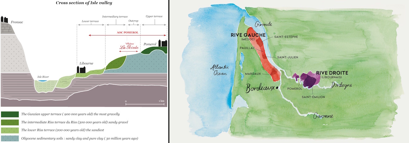 葡萄園位於Trotanoy酒莊延伸向下的梯田上,在Nenin酒莊旁邊。三種主要類型的土質:Isle河的梯田型河床的砂礫和卵石地質:是來自依次向西下行的梯田地勢再次出現的卓越土質,與波美侯高原的砂礫地性質一致。含砂礫的黏土地質:是公認的葡萄種植的最好土質。沙質表層土,黏土或砂礫下層土地質:潛力巨大的土質,但有排水問題(水份過量)。這種土質占葡萄園的30%,也正是在這種土質上有最大的品質提升潛力。基於2007/2008年進行的土壤和地質研究,實施了諸多重要的排水工程,提高了眾多著名酒莊的葡萄酒品質。