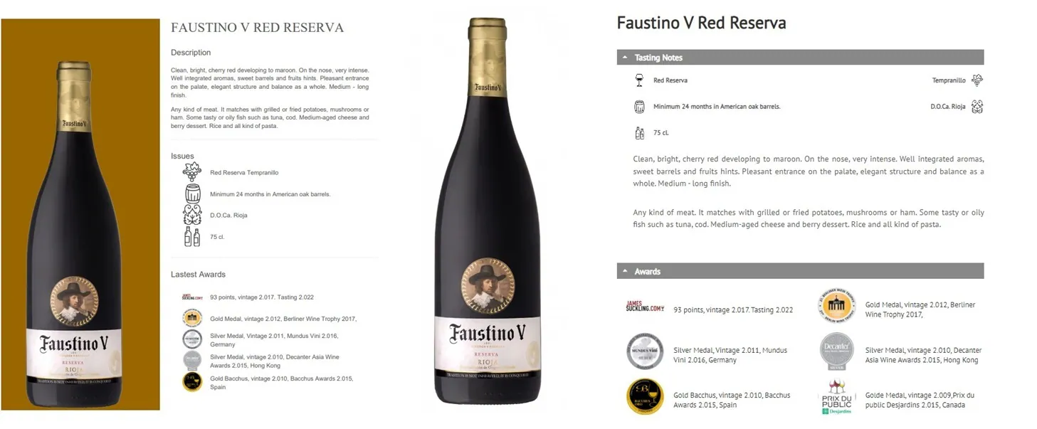 Today, Bodegas Faustino, located in Rioja Alavesa, encompasses 650 hectares. Faustino's wines are exported to over 100 countries worldwide, and the company is the world's best-selling producer of Gran Reserva.