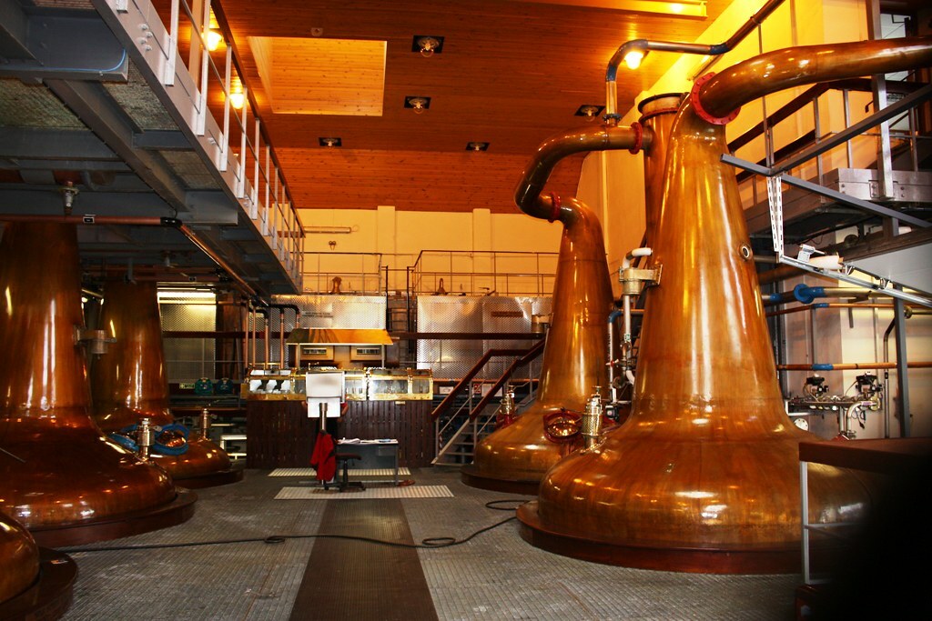 The distillery has two wash stills and three spirit stills, which is a highly unusual set-up in Scotland. The only other distillery to have such a production structure is Talisker on the Isle of Skye. The wash stills each have a capacity of 20’000 liters, while the spirit stills have a capacity of 12’500 liters. All of the stills have a traditional Speyside shape, with wide spherical lids and tall, conical necks. A not often seen specialty of the stills are the heavily bent lyne arms.