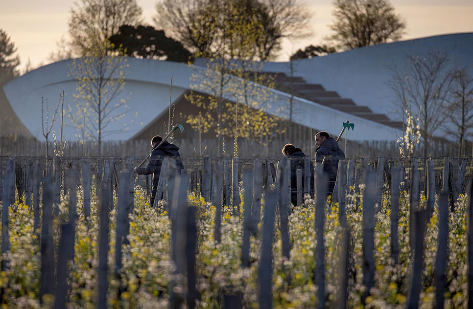 酒莊在葡萄園管理方面非常細緻。葡萄園被劃分為53個地塊,每個地塊由專人進行管理。這些經驗老到的工人長久以來管理著同一片葡萄園,對每一株葡萄藤的生長狀況都瞭若指掌。他們能迅速地、有針對性地進行相應的葡萄藤管理,保證葡萄健康均勻地成熟。葡萄採收時,葡萄園主管和技術總監會到葡萄園去,根據香氣的濃郁度、酸度和糖分的平衡度以及單寧的成熟度這三個成熟標準來對葡萄進行篩選,確保採收到完整成熟的葡萄。採摘後的葡萄總共會經過三輪的人工挑選,在葡萄園內會進行首次分揀,之後由4名工人在分揀臺上二次緩慢精挑,去梗後再次細挑。