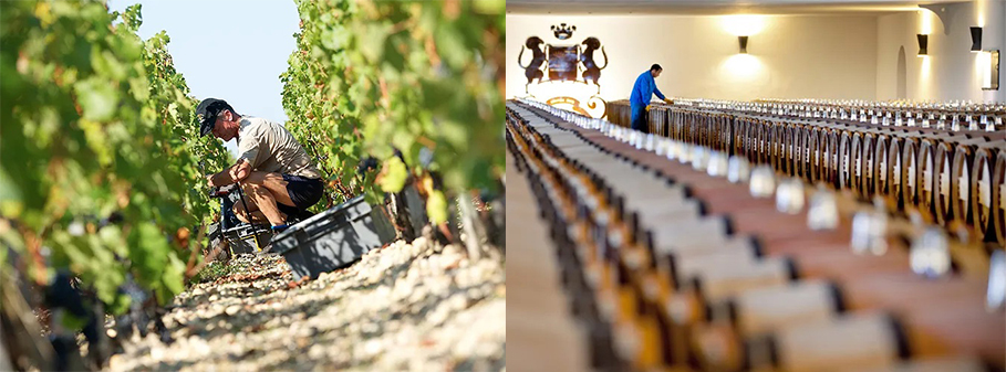 採收季時,酒莊會以手工的方式採摘和分揀葡萄果實,精心篩選後的葡萄僅靠重力經移動槽被置入發酵桶內。因此,從葡萄採收到其進入發酵桶的整個過程中,葡萄果粒不受任何非自然的壓力或約束,維持自然純粹的狀態。發酵結束後,酒液被移至新橡木桶中熟化20個月左右。熟化過程中,視具體情況可對葡萄酒進行補液,或是通過沉澱酒中的懸浮顆粒來澄清和穩定葡萄酒。2012年,木桐酒莊新的釀造車間正式投入使用,它將傳統工藝與現代科技融為一體。車間分為上下兩層,由金屬柱支撐相連。車間內部設有大小各異的橡木桶和不銹鋼罐,這些發酵容器與葡萄園的不同地塊和不同品種相互對應,以實現更為優化的釀酒調配處理。