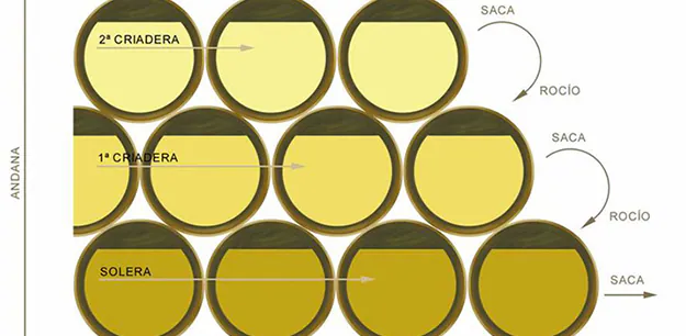Solera系統像是由多個橡木桶組成的「梯形」序列,從 Solera 的桶中抽出陳酒,不能超過三分之一的份量。 接著從上一排抽出三分之一補入 Solera 的橡木桶中,以此類推,直到在最頂端的桶中補入新酒為止。