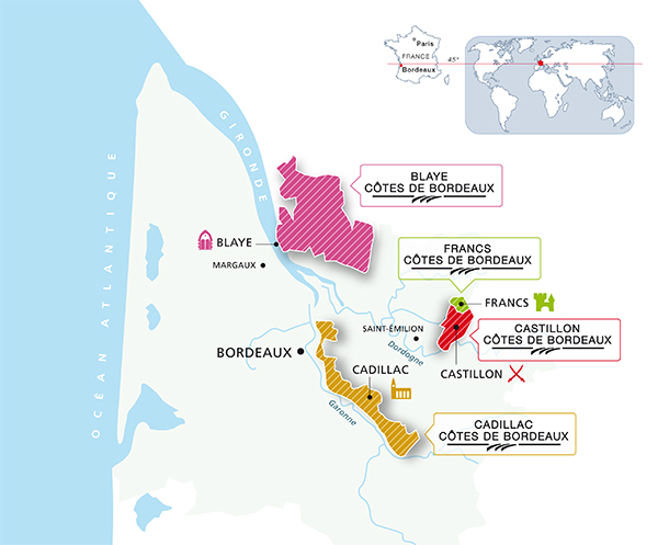 位於波爾多(Bordeaux)東部的卡斯蒂永(Castillon)地區,是波爾多丘(Cotes de Bordeaux)產區的一部分。波爾多丘法定產區成立於2009年,目的是要聯合產區內的所有酒莊,以提高市場開拓能力,簡化整個波爾多的產區結構。特別是,這些小產區也非常希望聯合起來尋找更寬廣的市場,與新世界釀制的波爾多(Bordeaux)風格的酒相抗衡。